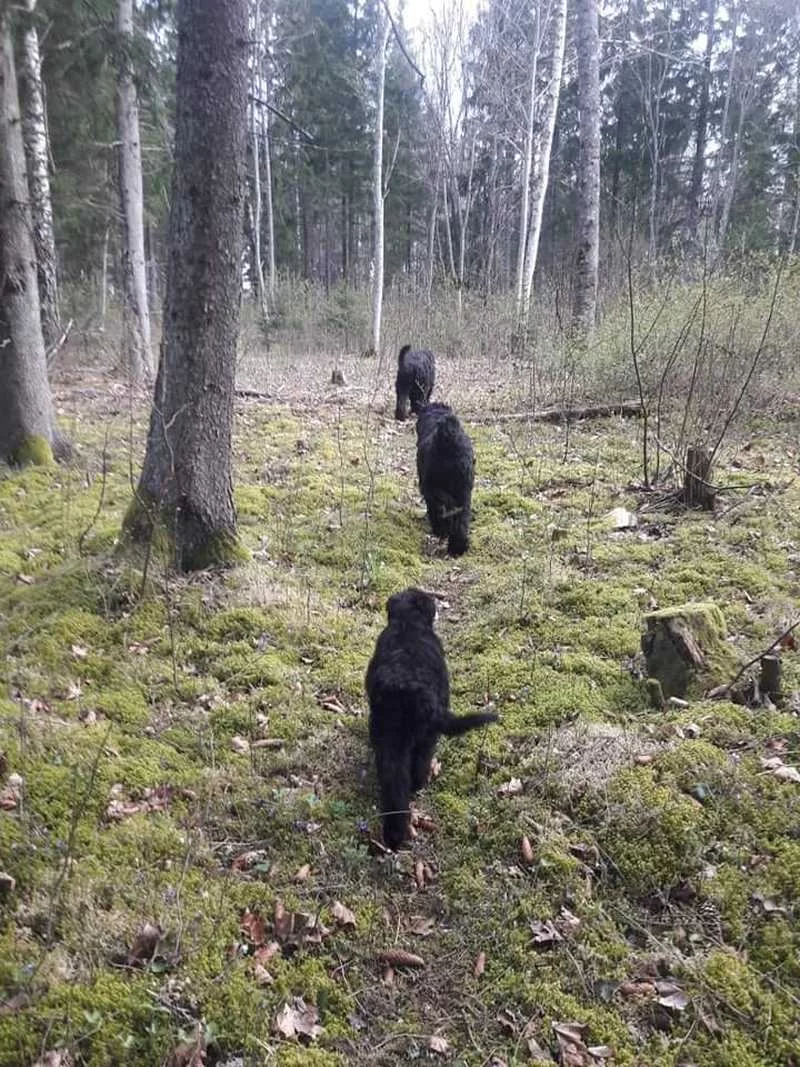 Little Astra Fidelis BOURBON is already in his new home in Estonia, where his older brother Astra Fidelis EINSTEIN and another older black terrier live. Below are some photos from the first walk in the Estonian forest. Good company for forest patrolling :)