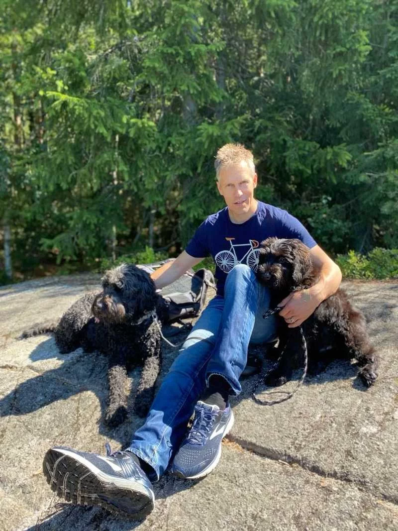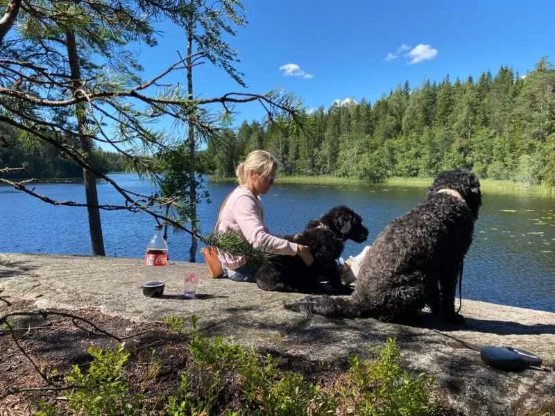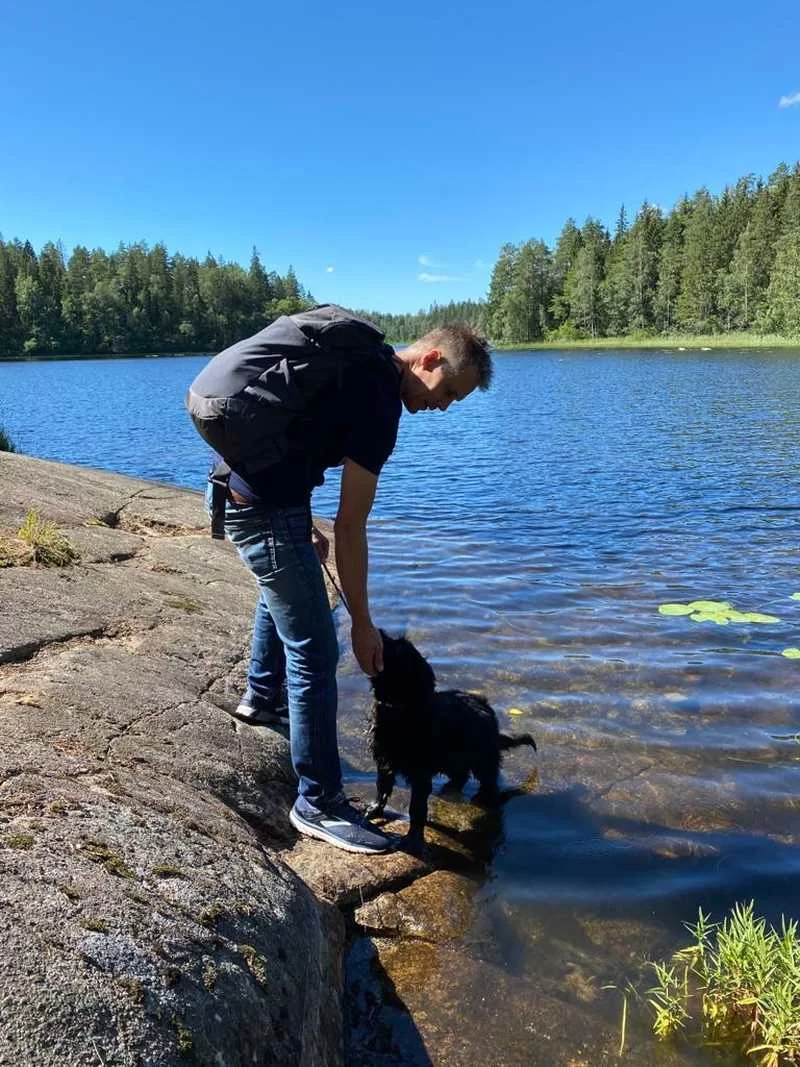 There are already quite a lot of black terriers from our kennel in Finland. They feel great there - beautiful forests allow hiking with the owners, and after the hike you can cool off in the lake. Another one has just joined them - Astra Fidelis NUKI. On the photos there is Nuki with his family and with a new friend, an older black terrier, on a trip to the Nuuksio National Park, located on the border of taiga and oak forests.